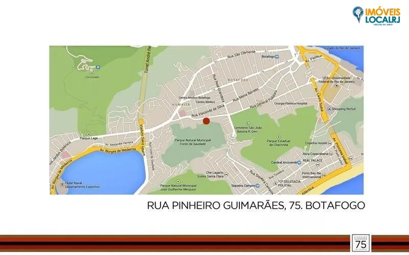 Na área nobre da Zona Sul do Rio Janeiro - na Rua Pinheiro Guimarães, em Botafogo.Próximo a hospitais, shoppings e bons restaurantes, o condomínio fica muito bem localizado.A poucas quadras do conceituadíssimo pólo gastronômico do Humaitá.