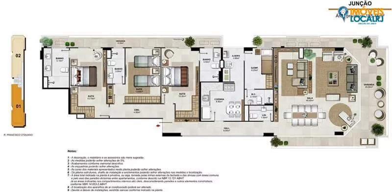 As plantas oferecem possibilidade de junção de apartamentos, coluna 1 com a 2 e coluna 3 com a 4, desta forma os apartamentos ficam com 3 suítes com 4 vagas de garagem.